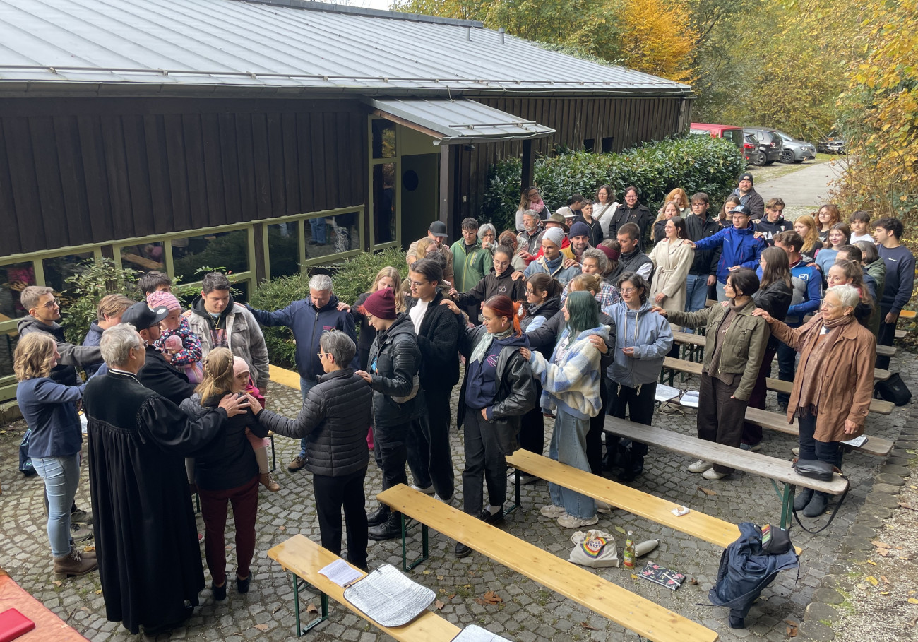 Verabschiedung von Dekanatsjugendreferent Christian Betzl in der Evangelischen Jugendbegegnungsstätte Rammelsbach. Beim Verabschiedungsgottesdienst hielt der Diakon die Predigt. Das Gitarrenduo „Bea und Joshi“ gestaltete den Gottesdienst musikalisch mit modernen geistlichen Liedern. Er und seine Familie wurden von Dekan Jochen Wilde gesegnet. Die Mitfeiernden bildeten zusammen einen Segensbaum.