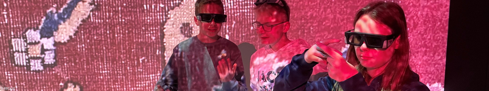 (v.l.n.r.) Luca Greis, Michael Lennox und Caro Hallinger aus den 7. Klassen der Ortenburger Evangelischen Realschule sind eingetaucht in die Welt der „Deep Space 8K-Installationen“ im Ars Electronica Center in Linz.